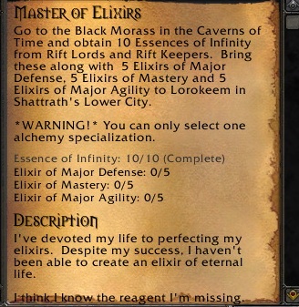 ただ残念なことに、Master of ElixirsになるためのQuestは、Questアイテムを得るために、The Black MorassってInstanceに行かねばならない、Shaman Lv73じぁさすがにソロ無理。